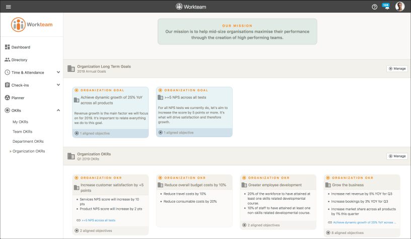 Finally, if your organization has a vision, mission statement or BHAG (big hairy audacious goal) that it wants to make clear to employees, this can be published with the organization’s longer term goals and OKRs, just like in the screenshot below.