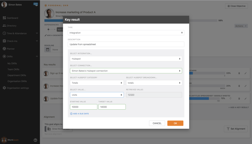 Hubspot is a marketing-focused CRM system that provides many different KPIs around your customers and their interactions with your website, landing pages and marketing campaigns. Workteam may be configured to associate the progress of a key result with one of many available Hubspot KPIs that are relevant to a marketing-led key result.